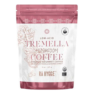 Rå Hygge Mushroom Coffee Tremella/Maitake Filtermalet Ø er en økologisk specialkaffe baseret på Arabica bønner tilsat Snow Fungus (Tremella) og Maitake-svampeekstrakt. Kaffen har en lidt mørkere ristning, der giver en dybere og fyldig smag. Med en pH-værdi på 6,5 er kaffen lavsyrlig og skånsom for maven takket være den patenterede efterbehandling. Den unikke blanding forener høj kvalitet med en spændende umami-smagsprofil.