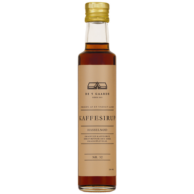 DE 5 GAARDE Kaffesirup Hasselnød er en sirup med en rund og afdæmpet smag af hasselnød. Den er fremstillet af udvalgte råvarer og passer til kaffe, latte, iskaffe og desserter. Siruppen er produceret i Danmark af De 5 Gaarde, der siden 2002 har sat smagen i centrum for alle produkter.