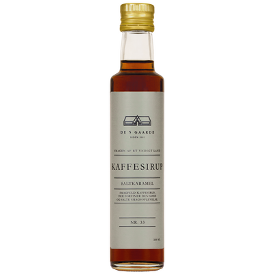 DE 5 GAARDE Kaffesirup Saltkaramel er en sirup med en sød karamelsmag afbalanceret med et let saltindhold. Den er fremstillet af udvalgte råvarer og passer til varme og kolde kaffedrikke, iskaffe, desserter og bagværk. Siruppen er produceret i Danmark af De 5 Gaarde, der siden 2002 har haft smagen i centrum.