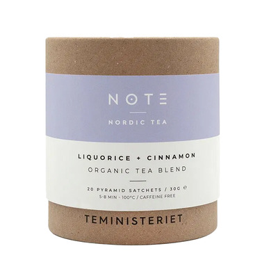 Teministeriet Note Liquorice Cinnamon leveres i en dekorativ tube med praktiske pyramideposer, der sikrer nem dosering og bevarer teens aroma. Den er certificeret økologisk under DK-ØKO-100 og indeholder ingen kunstige tilsætningsstoffer. En oplagt urtete til dig, der ønsker kraftig smag uden koffein.