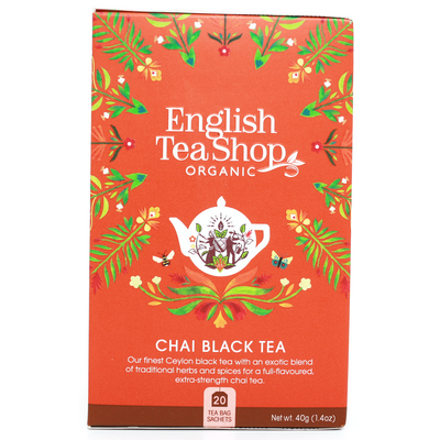 Chai Black Tea fra English Tea Shop er den lækreste teblanding med krydrede pift af økologiske ingredienser. Den indeholder, som navnet antyder, sort te og en intens chai-blanding af kardemomme, muskatnød, sort peber, gurkemeje, kryddernelliker, kanel og ikke mindst ingefær. Teen er fremstillet under Fairtrade-produktion, og emballagen, herunder sachetterne, er lavet af bæredygtige og komposterbare materialer.