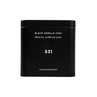 531 Black Vanilla Chai fra Teministeriet er en krydret og aromatisk te baseret på klassiske chaikrydderier med et strejf af vanilje. Den indeholder blandt andet kanel, ingefær, kardemomme, appelsinskal, rosenpeber og naturlig karamelaroma. Derudover kommer teen i en flot, sort tindåse med hvid skrift, som fint kombinerer gamle, østlige tetraditioner med skandinavisk design.