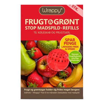Wrappy Frugt & Grønt Stop Madspild Refill indeholder 1 aktiv Wrappy Pod, som reducerer madspild ved at absorbere frugt og grøntsagers naturlige ethylengas. Gassen fremskynder modning og forrådnelse, men med en aktiv Pod i frugtskålen eller køleskabet forbliver dine madvarer friske og sprøde i længere tid. Pod’en virker i op til 3 måneder og er effektiv fra det øjeblik, du åbner plastemballagen.