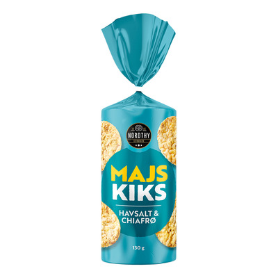 Nordthy Majskiks Havsalt & Chiafrø er sprøde, tynde majskiks med et strejf af havsalt og tilsatte chiafrø. Smagen er enkel og ren, og chiafrøene giver en let, nøddeagtig tekstur og er en kilde til fiber og omega-3-fedtsyrer. Posen på 130 gram er velegnet til hverdagens mellemmåltider og til at dele.