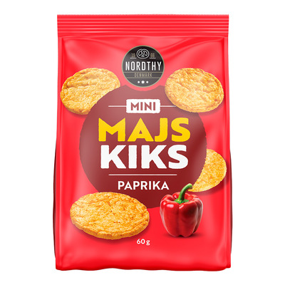 Nordthy Mini Majskiks Paprika er sprøde majskiks med en mild og krydret smag af røget paprika