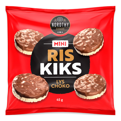Nordthy Mini Riskiks Lys Choko er små, sprøde riskiks med et lag lys chokolade. Kombinationen af den luftige, neutrale riskiks og det søde chokoladelag giver en behagelig og afbalanceret smagsoplevelse. Posen på 45 gram er praktisk til madpakken og pauser i hverdagen.