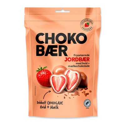 Nordthy Chokobær er frysetørrede jordbær overtrukket med et dobbelt lag hvid og mælkechokolade
