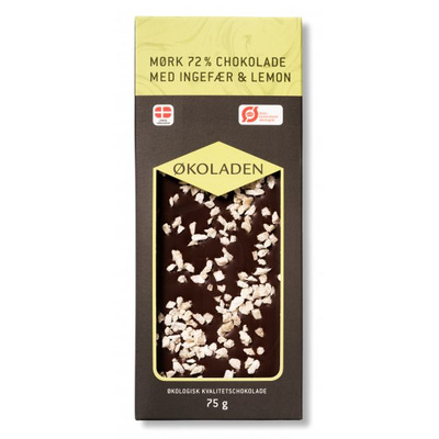 Økoladen Chokolade mørk ingefær/lemon er en økologisk chokoladeplade lavet af 72% mørk chokolade med tilsat ingefær og lemon. Ingefæren giver en krydret og varm smag, der komplementerer den intense mørke chokolade, mens lemon tilfører en frisk og syrlig note. Kombinationen giver en kompleks og afbalanceret smagsoplevelse.