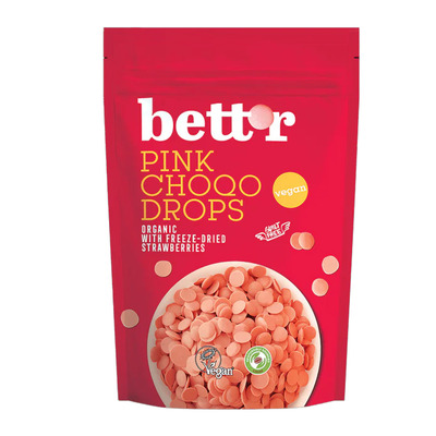Bett´r Choco Drops Pink er unikke, økologiske chokoladedrops med en smuk lyserød farve, skabt af naturlige ingredienser som jordbærpulver. Disse drops har en dejlig sød og frugtig smag, der gør dem perfekte til bagning, pyntning af desserter eller som en farverig snack. Med deres cremede konsistens og delikate smag tilføjer Bettr Choco Drops Pink både smag og et sjovt farvepift til dine yndlingsopskrifter.