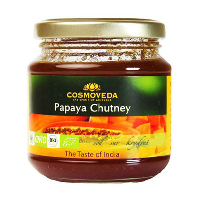 Cosmoveda Papaya Chutney har smagen af fuldmodne papaya og eksotiske krydderier. Tilberedt efter Cosmoveda's egen klassiske opskrift med udsøgte økologiske ingredienser.