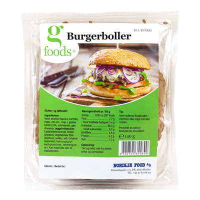 Virkelig gode burgerboller, der både er gluten- og laktosefrie. Disse boller er perfekte til store saftige burgere. Burgerbollerne kan spises direkte fra posen eller varmes. Der er 2 stk. burgerboller i pakken.