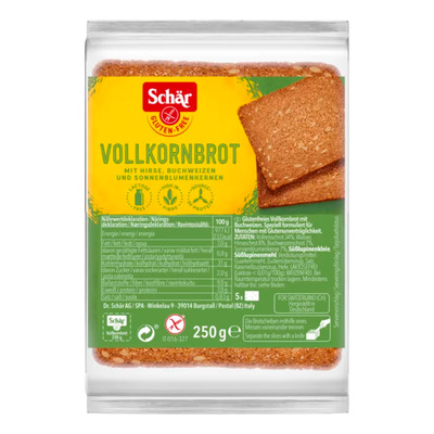 Schär Fuldkornsbrød har en fast konsistens og er skiveskåret for nem brug. Det kan serveres direkte fra pakken eller opvarmes let efter behov. Brødet er rigt på kostfibre og har en balanceret smag med både milde og let nøddeagtige noter.