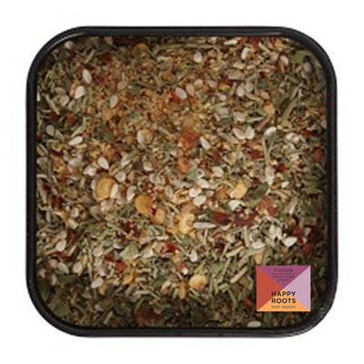 Herlig blanding af mange forskellige urter med rosmarin i forgrunden samt lidt chili og sesam. Til krydring af alle slags rodfrugter. Drys over udskårne kartofler og andre rodfrugter vendt i lidt salt og olie og bag i ovnen. Blandingen kan også anvendes i mos, rösti, på rodfrugtbøffer eller som krydderi på pommes frites. Økologisk.