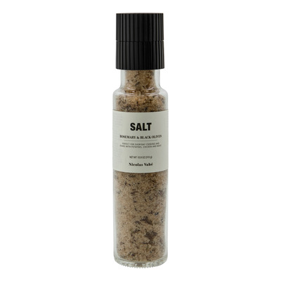 Nicolas Vahé Salt Rosemary & Black Olives er en aromatisk havsaltblanding med rosmarin og sorte oliven. Den giver en fyldig, middelhavsinspireret smag, som løfter både enkle og mere komplekse retter. Saltet kommer i en praktisk kværn, som gør det let at dosere og bruge direkte ved bordet eller under madlavningen. Den karakteristiske smag passer særligt godt til retter med kylling, oksekød eller pasta.