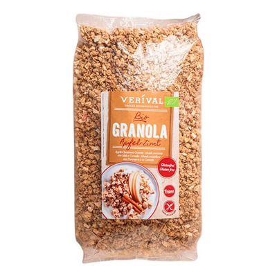 Verival Granola Æble/Kanel er en økologisk granola lavet med glutenfri fuldkornshavre, sprøde risflager og ægte Ceylon kanel. Den indeholder bagte havreflager, æbletern og krydderi, som tilsammen skaber en mild og varm smag. Granolaen er uden tilsat sukker og har et naturligt højt indhold af fibre. Den sprøde struktur gør den ideel som topping eller som mættende morgenmad. Blandingen er både vegansk og glutenfri.