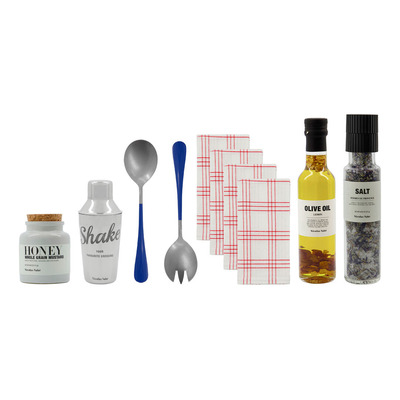 Brug citronoment olivenolie til salater eller som finish på retter. Fyld shaker med urtesalt og placer på bordet. Brug honning-senneppen som dressing eller marinade. Servér salat med det medfølgende salatsæt. Pynt bordet med de medfølgende servietter. Opbevar produkterne køligt og tørt.
