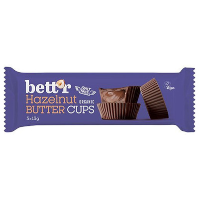 Bettr Nut Butter Cups med hasselnøddecreme er lækre økologiske chokoladekopper fyldt med en cremet hasselnøddecreme. Disse kopper er lavet med mørk chokolade af høj kvalitet og en silkeblød nøddecreme, der giver en rig og intens smagsoplevelse.