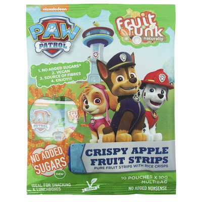 Paw Patrol frugtsnacks fra Fruitfunk er lækre, crispy og helt fri for både gluten, laktose, kunstige farvestoffer og tilsat sukker. De er baseret på æblemos og -juice samt puffede ris, som tilføjer lidt ekstra knas.