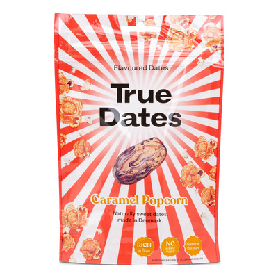 True Dates Caramel Popcorn er udstenede dadler (90%) med smag af karamelpopcorn. Disse dadler er et lækkert alternativ til traditionelt slik. True Dates Caramel Popcorn er rige på fibre, uden tilsat sukker og indeholder kun naturlige smagsstoffer. Hver bid tilbyder en sød og let salt smagsoplevelse med en karakteristisk popcornsmag.
