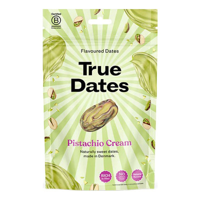 True Dates Pistachio Cream er udstenede dadler (83%) med pistaciepasta (4%). Disse dadler er et lækkert alternativ til traditionelt slik. True Dates Pistachio Cream er rige på fibre, uden tilsat sukker og indeholder kun naturlige smagsstoffer. Hver bid tilbyder en cremet og nøddeagtig smagsoplevelse med en afrundet sødme fra dadlerne.