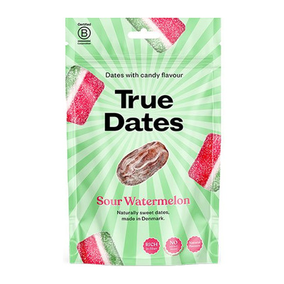 True Dates Sour Watermelon kombinerer sødmen fra dadler med smagen af sød/sur vandmelon Disse dadler er et lækkert alternativ til traditionelt slik. True Dates Sour Watermelon er rige på fibre, uden tilsat sukker og indeholder kun naturlige smagsstoffer. Hver bid tilbyder en harmonisk balance af smag, der tilfredsstiller dine smagsløg. True Dates er perfekte til dem, der ønsker en sød godbid. Bemærk, at dadlerne kan indeholde daddelsten eller fragmenter af daddelsten.