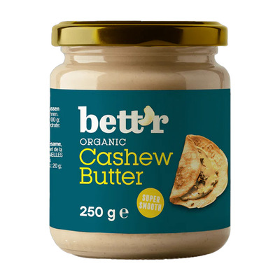 Bettr Cashew Butter er et cremet og lækkert økologisk cashewsmør fremstillet af 100% ristede cashewnødder. Med sin silkebløde tekstur er dette cashewsmør velegnet som pålæg, i smoothies eller som en ingrediens i bagning.