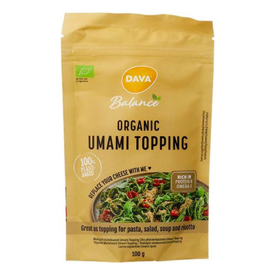 Dava Umami Topping Ø er lavet af økologiske hampefrø, malet groft med salt og gærflager. Toppingen har en aromatisk smag, der minder om revet parmesan. Produktet er 100 % plantebaseret og velegnet som erstatning for ost, hvilket gør det ideelt til veganere og personer med laktoseintolerance. Med sit høje indhold af protein og omega-3 er det også et nærende valg til din daglige madlavning.