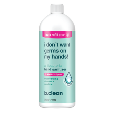 b. clean i don't want germs on my hands! håndsprit-gel i ekstra stor refill-størrelse med nok til lang tids brug