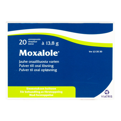 Moxalole til voksne opløses i et halvt glas vand (1,5 dl) og drikkes umiddelbart efter. Det er pakket i enkeltdoseringsbreve, og et brev er en dosis. Den afføringen virkning ses sædvanligvis efter 12-24 timer.