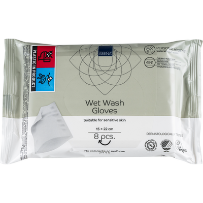 ABENAs vådvaskehandske har en behagelig, rensende og fugtgivende effekt, og er et rigtig godt alternativ til det traditionelle bad med vand og sæbe. Handsken skal ses som en 4-i-1 klud med en for- og bagside. Med hånden inde i handsken har man god kontrol over begge sider af handsken. Er man færdig med et vaskestrøg, kan vaskehandsken drejes uden at man behøver komme i kontakt med den urene side.