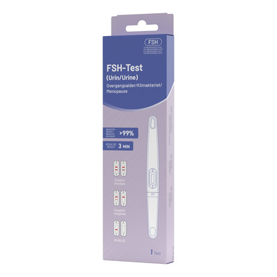 Nordic Tests Overgangsalder test FSH måler niveauet af FSH (follikelstimulerende hormon) i urinen. FSH stiger markant, når æggestokkenes funktion aftager, og forhøjede FSH-niveauer er et af de tidligste tegn på begyndende overgangsalder eller nedsat æggestokreserve. Testen kan anvendes enten ved at dyppe testpinden direkte i en opsamlet urinprøve eller ved at urinere direkte på pinden. Resultatet aflæses inden for 10 minutter.