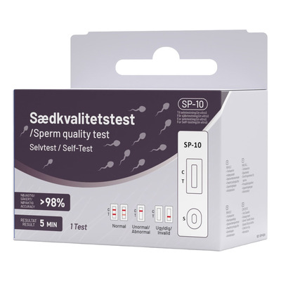 Nordic Tests Sædkvalitet Selvtest måler sædkoncentrationen i en ejakulatprøve og angiver, om koncentrationen er inden for det normale område eller lavere. Sædkoncentrationen er en af de vigtigste parametre ved vurdering af mandlig fertilitet. Testen er CE-godkendt, leveres med alt nødvendigt udstyr og en trin-for-trin vejledning, og kræver ingen laboratorieudstyr eller særlige færdigheder. Prøven skal indsamles 3–7 dage efter den seneste ejakulation for at sikre et retvisende resultat.