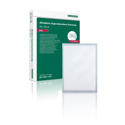 Kliniderm Superabsorberende bandage er fremstillet specielt til anvendelse på moderat til kraftigt væskende sår. Den indeholder superabsorbanter (polymer), som absorberer mange gange sin egen vægt og ”låser” væsken i bandagen. Derudover kan bandagen, i mindre mængder, absorbere blod, hvilket minimerer risikoen for maceration af den omkringliggende hud. Produktet har en semipermeabel, væskeafvisende, blå bagside og indeholder ingen klæbe- eller bindemidler.