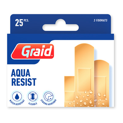 Anvend Graid Aqua Resist Plaster til at dække og beskytte mindre skader, især i fugtige omgivelser. Sørg for at huden er ren og tør før plasteret påføres for bedste resultat.
