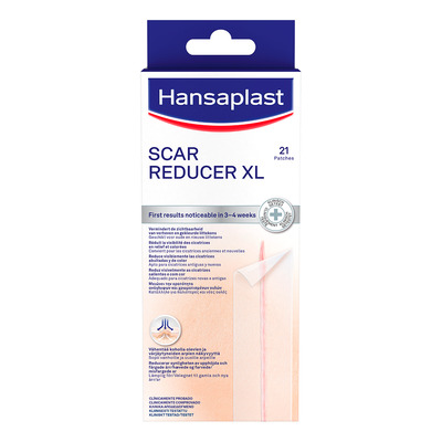 Hansaplast Scar Reducer XL indeholder 21 plastre, der anvendes dagligt i mindst 12 timer. Plastret gør ar fladere, blødere og lysere. Det er ikke egnet til åbne sår, forbrændinger eller børn under 3 år. Følg altid brugsanvisningen for sikker og effektiv brug.