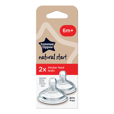 Tommee Tippee Natural Start Flaskesut Thick Feed har indbygget anti-kolikventil, der reducerer luftindtag og dermed risikoen for kolik. Den er fremstillet i BPA-fri silikone og er velegnet til babyer fra 6 måneder og opefter.