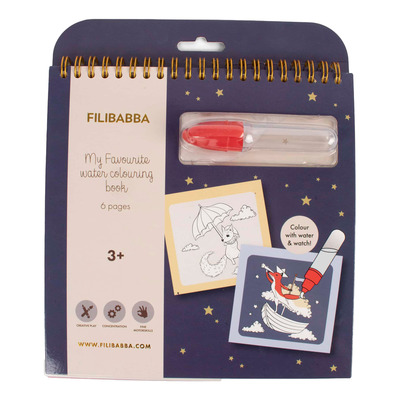 Filibabba Vandmalebog – Dreamy Adventurers indeholder illustrationer med motiver fra det kendte printunivers, hvor dyr, luftballoner og stjerner fylder siderne. Når siderne tørrer, kan de males igen og igen.