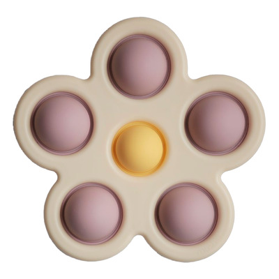 Mushie Flower Press Toy - Soft Lilac/Pale Daffodil/Ivory træner sanser og motorik med farvede trykbobler