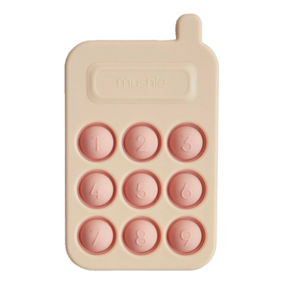 Denne Mushie Telefon er et sjovt fidget-legetøj inspireret af telefonen, men lavet så små børn kan holde den. Legetøjet fremmer finmotorikken og sanserne hos barnet, mens det udforsker de sjove bobler, der kan skubbes og poppes. Legetøjstelefonen er lavet i fødevaregodkendt silikone i bløde farver og enkelt design, så man kan være uden bekymring, hvis barnet vil gumle på det bløde silikone.