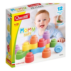 Quercetti Momy Soft er et sæt med 12 bløde klodser, der er sikre og farverige til byggeri med børn