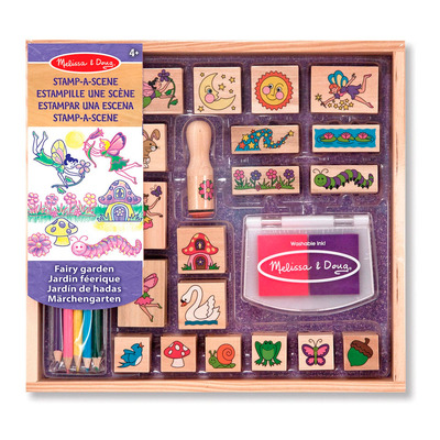 Melissa and Doug Stempelsæt Eventyrhave er et fantasifuldt legesæt med 20 træstempler, fem farveblyanter og en tofarvet blækpude. Motiverne inkluderer feer, blomster og havedyr, som børn kan bruge til at skabe deres egne haveeventyr. Blækket er lyserødt og lilla og vaskbart, så legen er både kreativ og nem at rydde op efter.