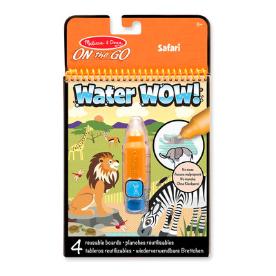 Melissa and Doug Water Wow Safari giver børn mulighed for at male uden brug af maling og uden rod. Bogen indeholder fire genanvendelige sider med safariscener, som afslører farver og detaljer, når de males med den medfølgende vandpen. Når siderne tørrer, forsvinder farverne igen, så børnene kan male dem på ny.