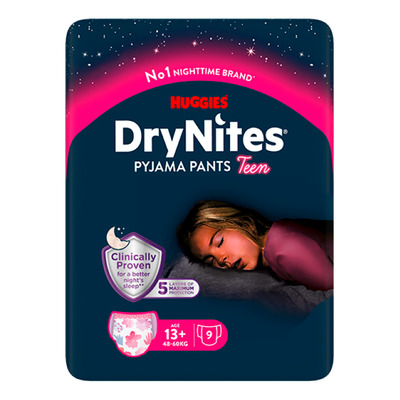 Huggies DryNites Girls 13+ år er natunderbukser, der har samme funktion som en ble til natlige uheld