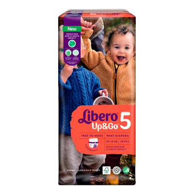 Libero Up&Go 5 har en superabsorberende kerne kombineret med dobbelte lækagebarrierer, der giver effektiv lækagebeskyttelse hele døgnet. Bleerne er lotionfri, dermatologisk testede, Svanemærkede og anbefales af Asthma Allergy Nordic. De er desuden certificerede af FSC.