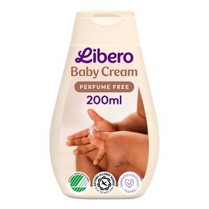 Libero Baby Cream er en mild creme uden tilsat parfume, som er udviklet til babyer og børn med sensitiv hud. Den indeholder naturlige olier fra havre og raps, der hjælper med at fugte og blødgøre huden. Cremen kan bruges til hele kroppen, fx kinder, hænder og ben, og absorberes hurtigt uden at fedte. Den er velegnet til daglig pleje af tør eller sart hud.