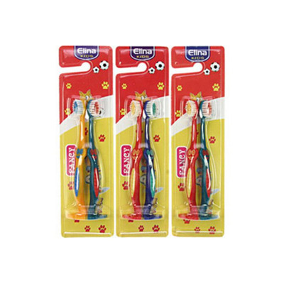 Elina børnetandbørster kommer i en pakke af to. Tandbørsterne har et farverigt design og en form med gummi der sikrer barnet et godt greb.