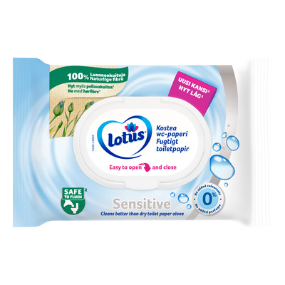 Lotus Fugtigt Toiletpapir Sensitive er skånsomt fugtigt toiletpapir til daglig hygiejne uden tilsat parfume