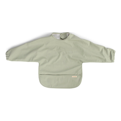 Filibabba Hagesmæk Sage Green er en praktisk spisesmæk med lange ærmer, der er designet til at beskytte barnets tøj under måltider og kreative aktiviteter. Den er lavet af blød polyester med PU-coating, som gør den vandtæt og nem at rengøre. Den rummelige opsamlingslomme forhindrer mad og væske i at ende på gulvet. Hagesmækken lukkes nemt med velcro i nakken og sidder godt takket være elastik ved håndleddene.