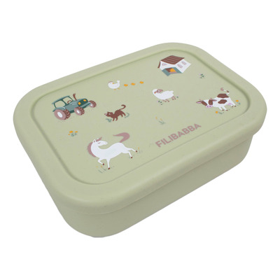 Filibabba Madkasse i silikone - Bog Green er en sød madkasse med bondegårdsdyr til praktiske måltider på farten