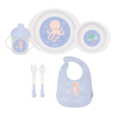 SARO BABY Ocean Life Spisesæt har søde motiver med dyr fra havet, hvilket er underholdende for baby